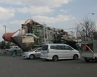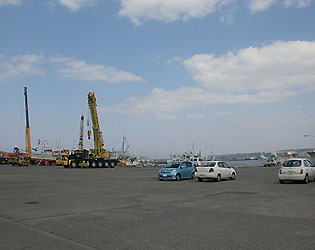 震災ゴミが出されてあります。また、海中に沈んだ船をクレーン